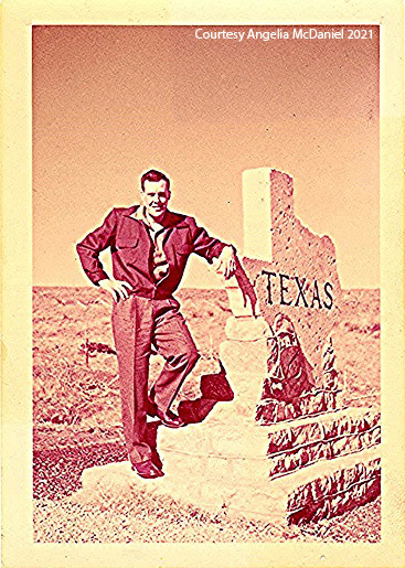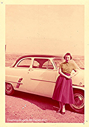 John Dennis Rush, Jr. poses next to a Texas statue. I gave it my best effort to try to determine where this was taken. It appears to be in the middle of nowhere, which could be anywhere in 1955! And there aren’t any trees which is not unusual for Texas. The “Texas” shaped statue throws me off – it seems like these types of photo opportunities are at the border – so Texas and Oklahoma. But the couple would have taken a short detour north of Sheppard Air Force base to reach the border. Anything is possible. But not sure how likely it is. If anyone has thoughts on the location please comment.