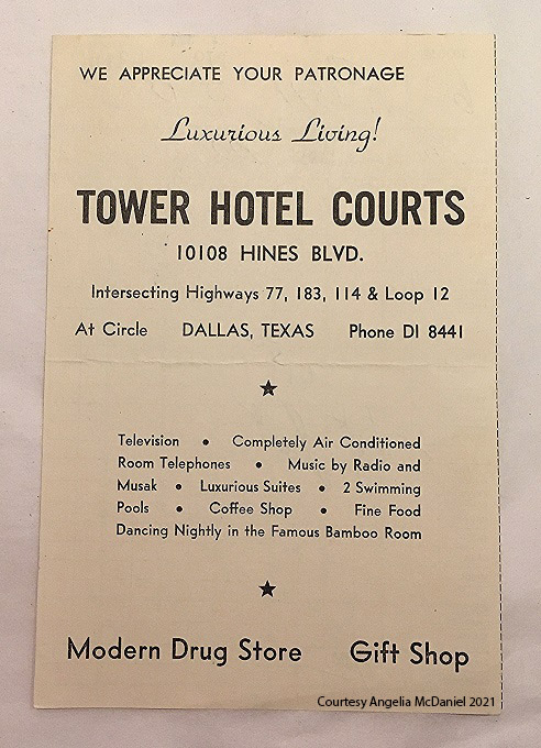 Preface: Hopefully you’ve been following along in this series. If you’re new, the quick rundown: I fancy myself the “caretaker” of the Tower Hotel Courts in Dallas, even though it has been demolished for many years.