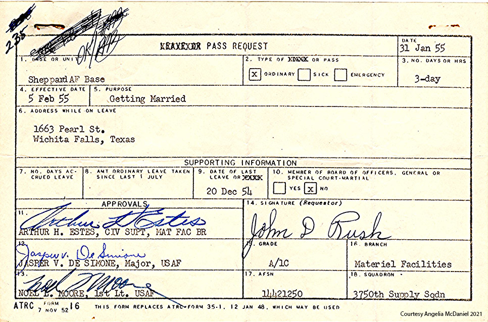 Angelia has the “PASS REQUEST” her father used to get leave from Sheppard Air Force base for the wedding. The Leave was effective February 5, 1955 with a “PURPOSE” of “Getting Married” and the “NO. DAYS OR HRS” of the leave was “3-day”. The “ADDRESS WHILE ON LEAVE” was 1663 Pearl St, the same one listed in the wedding announcement.