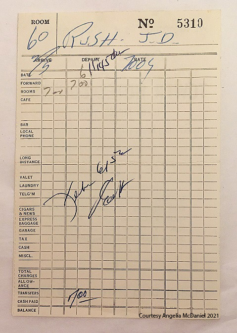 The back of the receipt has great details. They stayed in room 60. The cost of the room was $7.00. The check out appears to be February 6th at 11:45. Angelia shared that she recognized her dad’s handwriting on the top of the receipt, “Rush, J. D.”