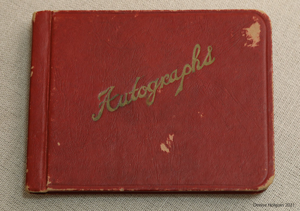 I walked briskly to the area, picked a wildflower and solemnly opened the autograph book to the page with Helen Edwards’ message to Ramona. I placed the wildflower on the page and prepared to take my photo with the book on the ground.