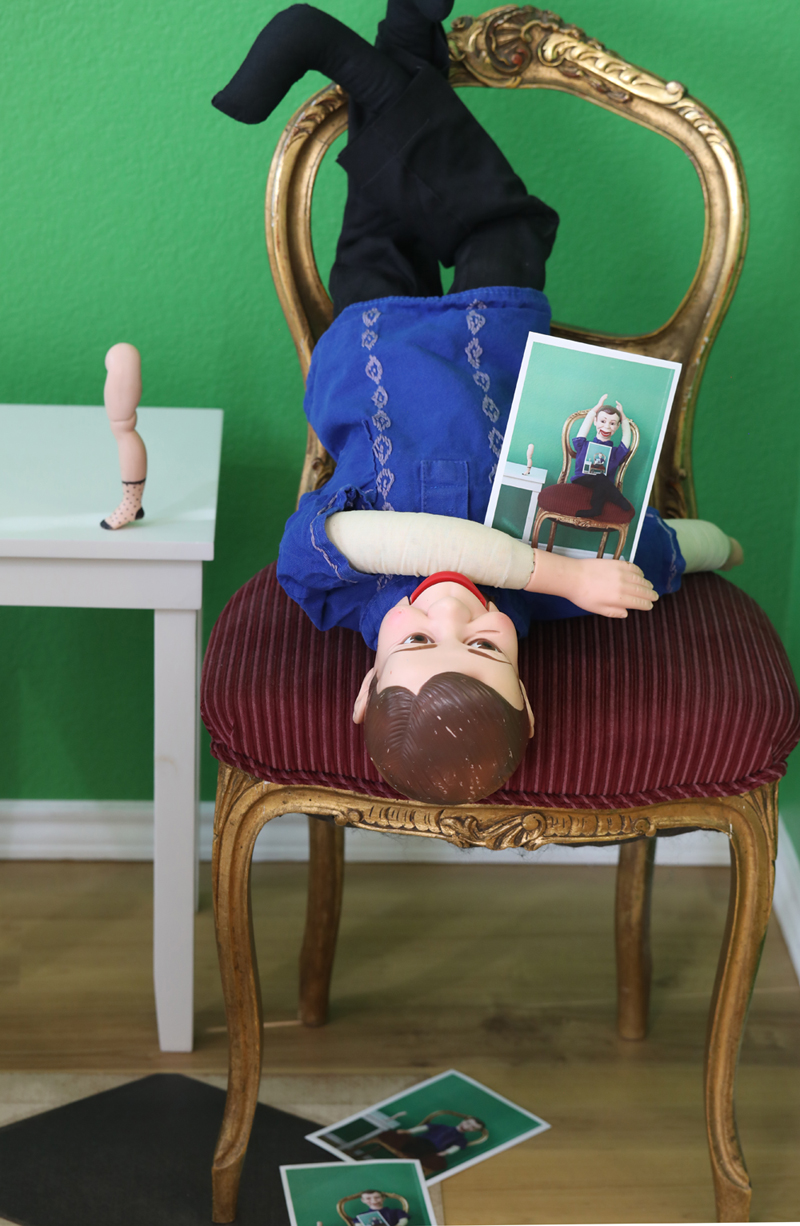 I adapted the set from my first photo, “Iterations”. I used my ventriloquist’s doll, Percival Sunshine, as the model. Judging by the photo you might conclude I have a carnival funhouse of props. It does appear that way! My favorite element in the photo is the doll leg, with the hand drawn polka dot sock.