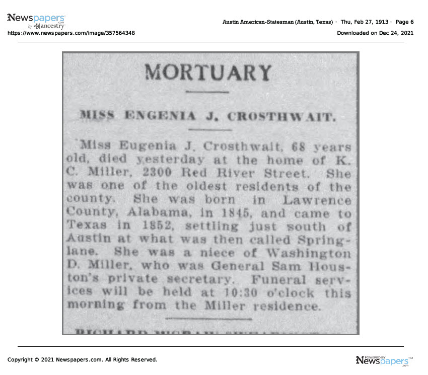 Miss Eugenia J. Crosthwait, 68 years old, died yesterday at the home of K. C. Miller, 2300 Red River Street. She was one of the oldest residents of the county. She was born in Lawrence County, Alabama in 1845 and came to Texas in 1852, settling just south of Austin at what was then called Springlane. She was a niece of Washington D. Miller, who was General Sam Houston’s private secretary. Funeral services will be held at 10:30 o’clock this morning from the Miller residence.”