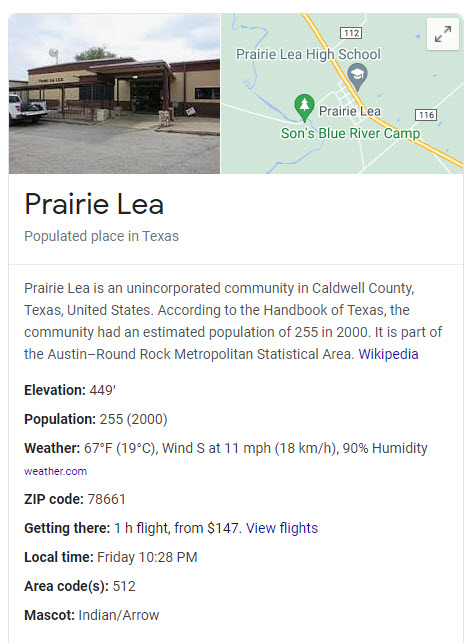 Data below courtesy of Google/Wikipedia search of “Prairie Lea”. The population in 2000 was 255.