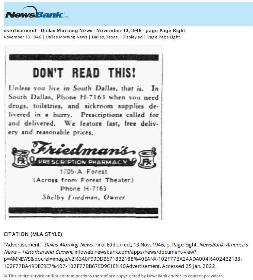 I briefly researched Shelby B. Friedman, the owner of the pharmacy.  He was born in 1911 and served in WWII.  He was 91 years old when he passed away Dec 2002.  His wife is Rebecca Friedman. I found several Dallas Morning News articles that mention Mr. Friedman.  Based on the letters, you get a sense for why the headline in the pharmacy advertisement teased with “Don’t read this!”  Mr. Friedman made a lasting positive impression in the community.