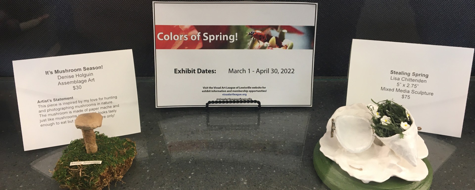 I had the opportunity to manage this exhibit in the display case for the Visual Art League. We have 11 participants who submitted their art. There are paintings, mixed media sculptures, photos and digital mixed media creations.