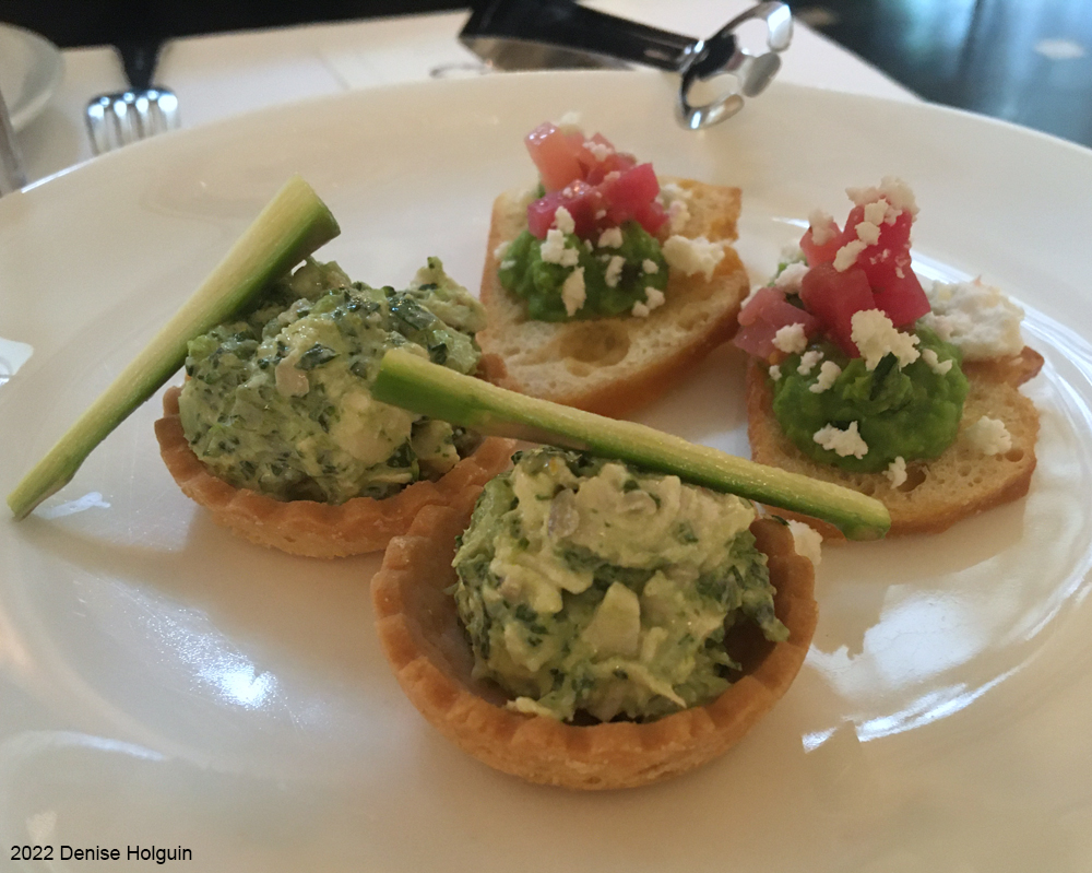 Creamy asparagus and chicken salad tart. Honey-roasted beet, spring pea, and feta crostini. (Only The French Room can make beets eatable!)