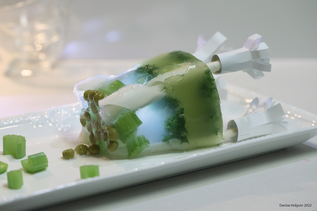 Artist’s Statement: My aspic series explores the changing perceptions of what is considered appetizing. Research yields images of what some may perceive as grotesque, vomit-inducing aspics (gelatin). But the “modern housewife” of the 1950s took great pride in her ability to feed her family on a budget while presenting an artistic creation. I decided to revisit aspic but through La Poodle feeding her pups. Bone Appétit!