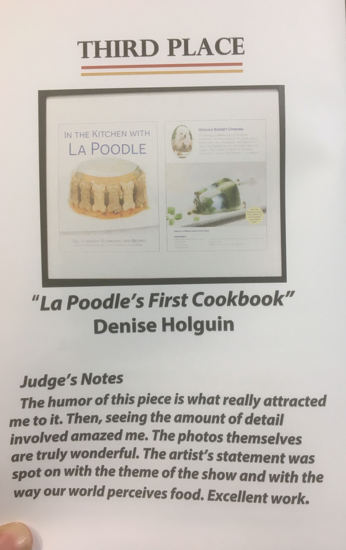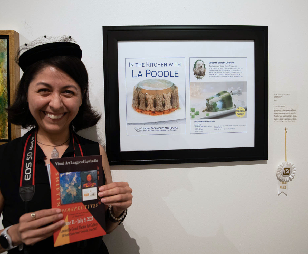 My art piece, “La Poodle’s First Cookbook” placed 3rd place in the “Shifting Perspectives” art exhibit through the Visual Art League of Lewisville. This is the first time my art has placed and it is rather unexpected. I was waffling on what to submit and almost didn’t enter this piece.