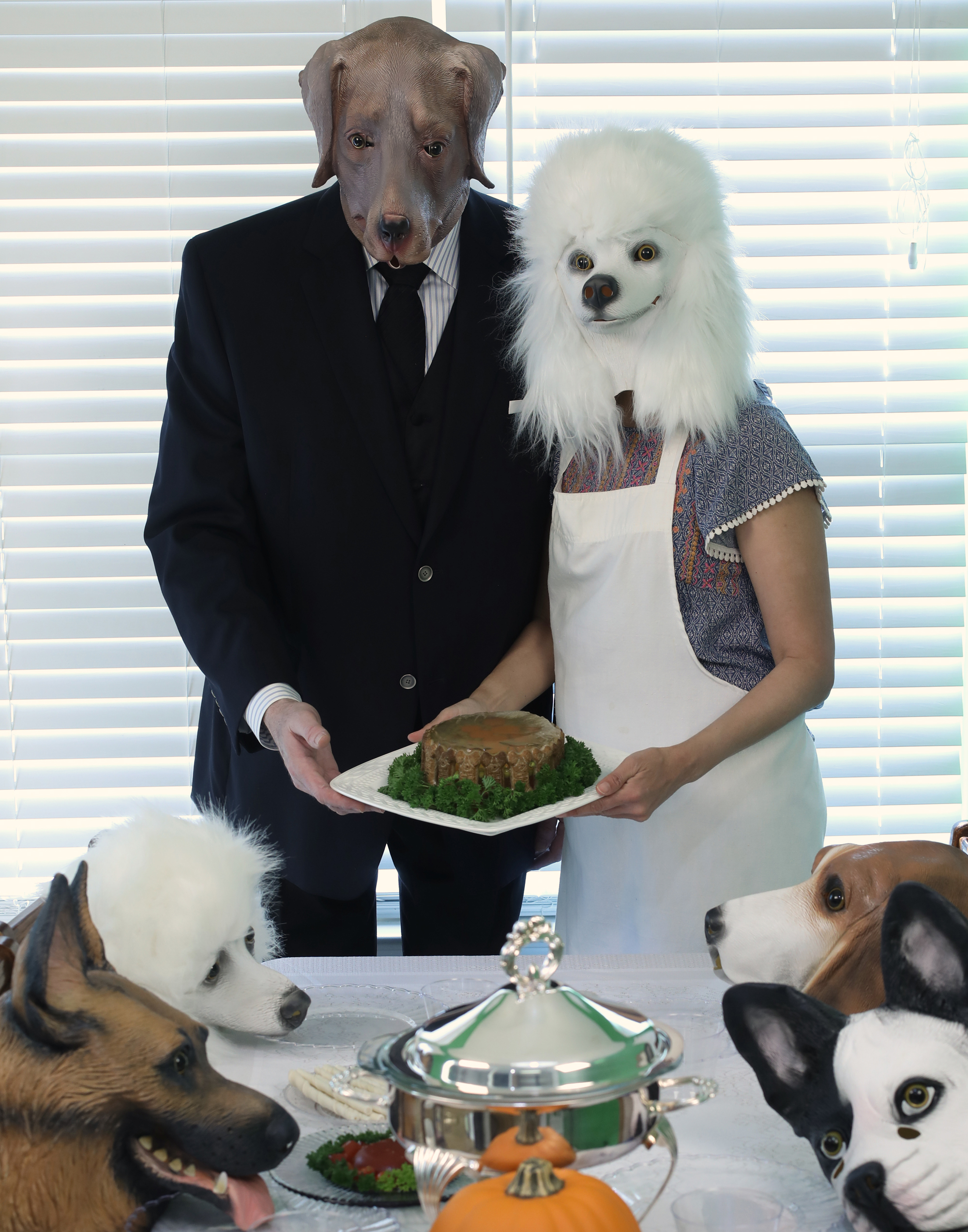 “Freedom From Begging” was a lot of work but I loved the outcome. If you look closely, you’ll notice chew sticks in the photo and my first aspic creation, a tomato aspic. The pups are my 4 ventriloquist’s dolls: Percival, Winthrop, Mortimer and Finnegan. Tore Bellis is the dog in the suit.