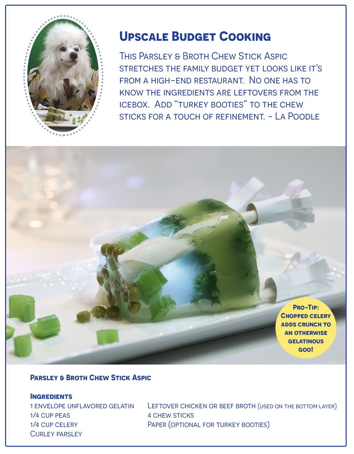 The milkbone aspic was a thing of grotesque beauty that needed its moment to shine. I decided on a cookbook authored by La Poodle.