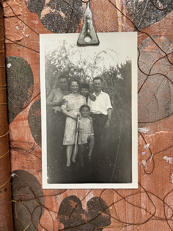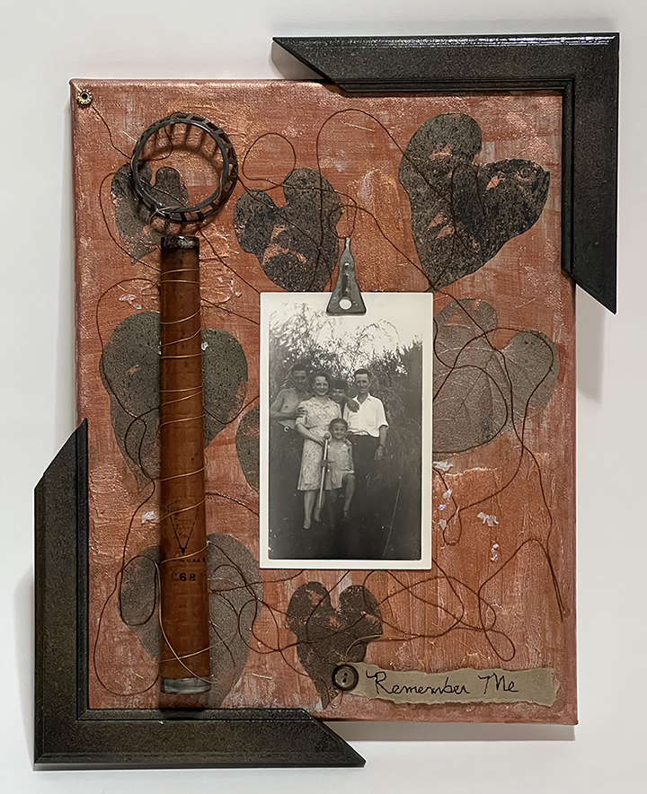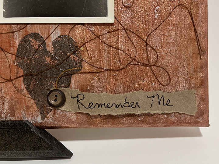 De Profundis / Psalm 130: The words are written on the canvas but then I realized no one wants to be saddened by the prayer and it contrasted too much with the happiness in the photo. I covered up the prayer with crackle. (It’s in the bottom right corner, near “Remember Me”.)