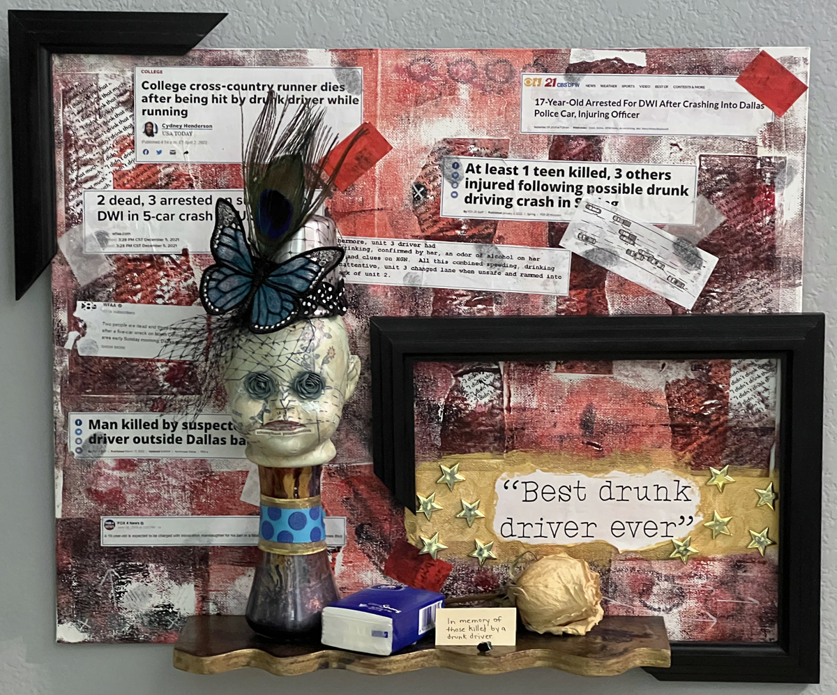 Artist’s Statement: The doll baton is my version of a conch from Lord of the Flies. Whoever holds the doll baton has the floor to speak on behalf of drunk driving victims. There are tissues to wipe the tears and a rose to leave at a tombstone. There’s a tiny piece of shattered windshield that serves as a reminder of irreversible destruction and terror.