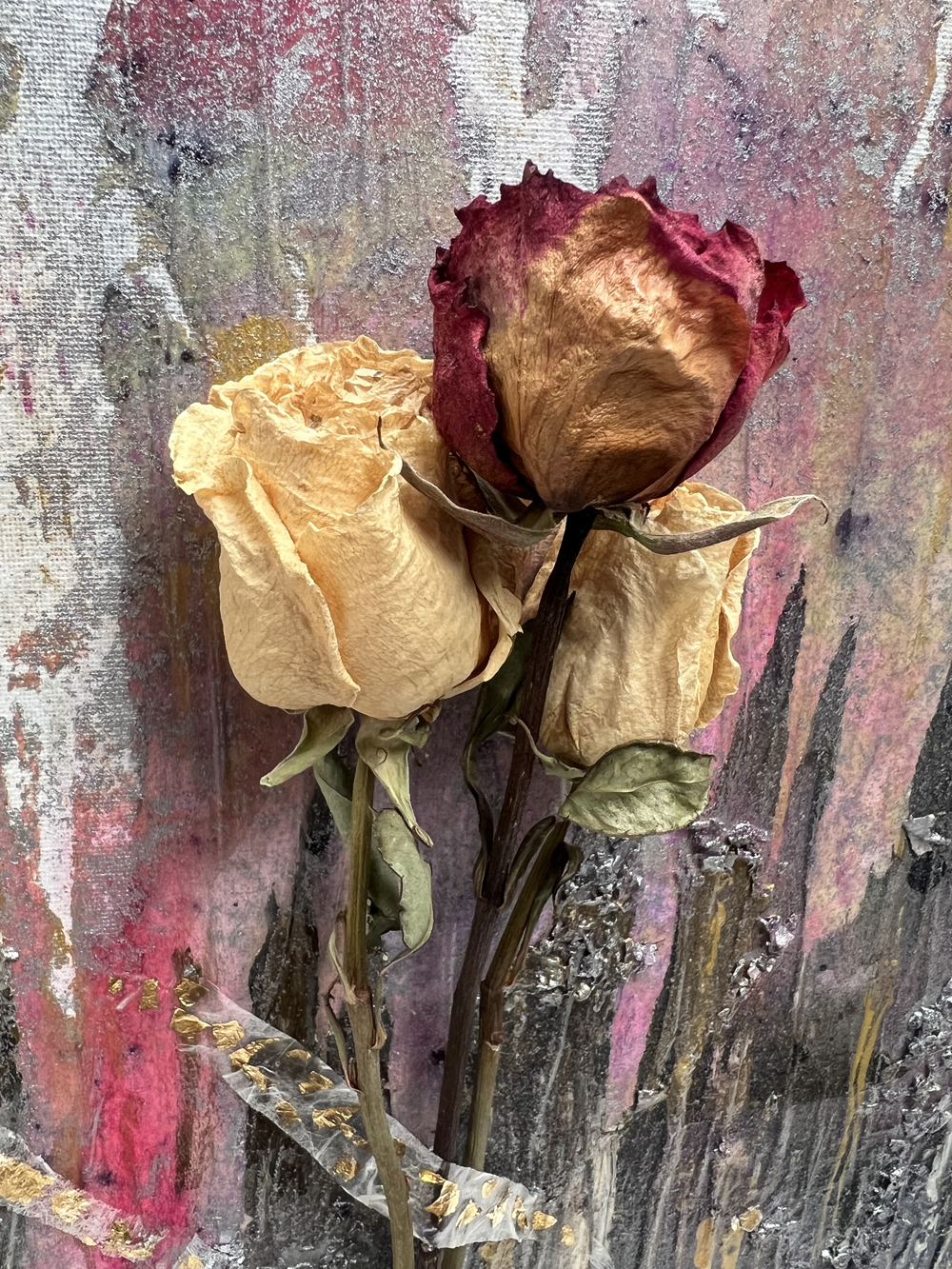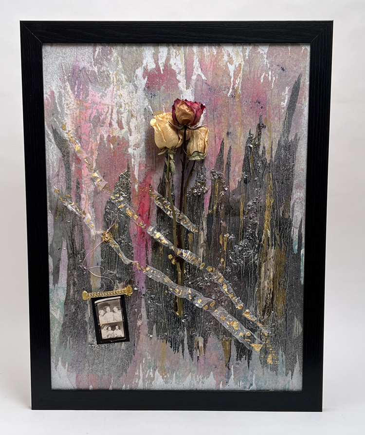 Artist’s Statement: From dust we came, to dust we shall return.  The photo of the three women represents the vibrancy, youth and vitality of our existence on this earth.  But just as roses whither and fade, so do we.  Our hope is that the beauty of our soul remains and continues on in the afterlife.  This is represented by the sweeping upward motion of the shades of pinks, purple, light blues as well as the golden ‘ribbons’ that wrap around the roses.