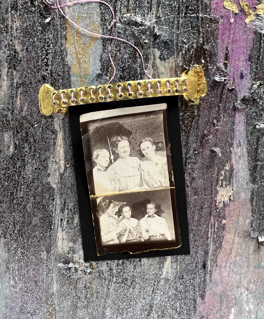 I photographed the back of the photo before attaching it to the art piece. The names appear to be: Sallie S. Cox, A.B. Simpson, Opal Payne. While it pains me to attach the image and lose the history on the back, I justify the action because the photo was gifted from one person to the next until it ended up in my hands.