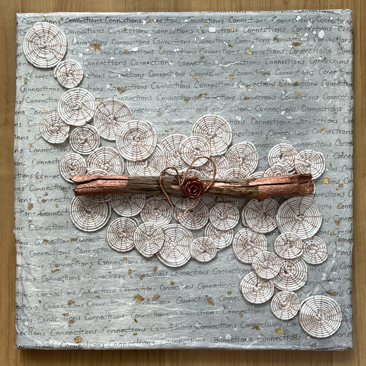 Wax paper: a gift from my friend Paulette – she knows I’m an artist and is supportive of my efforts. I hand wrote the word “Connections” all over the paper. This is my second art piece (I have a half dozen) that include a handwritten word repeated across a canvas. (I am a writer – I love words).