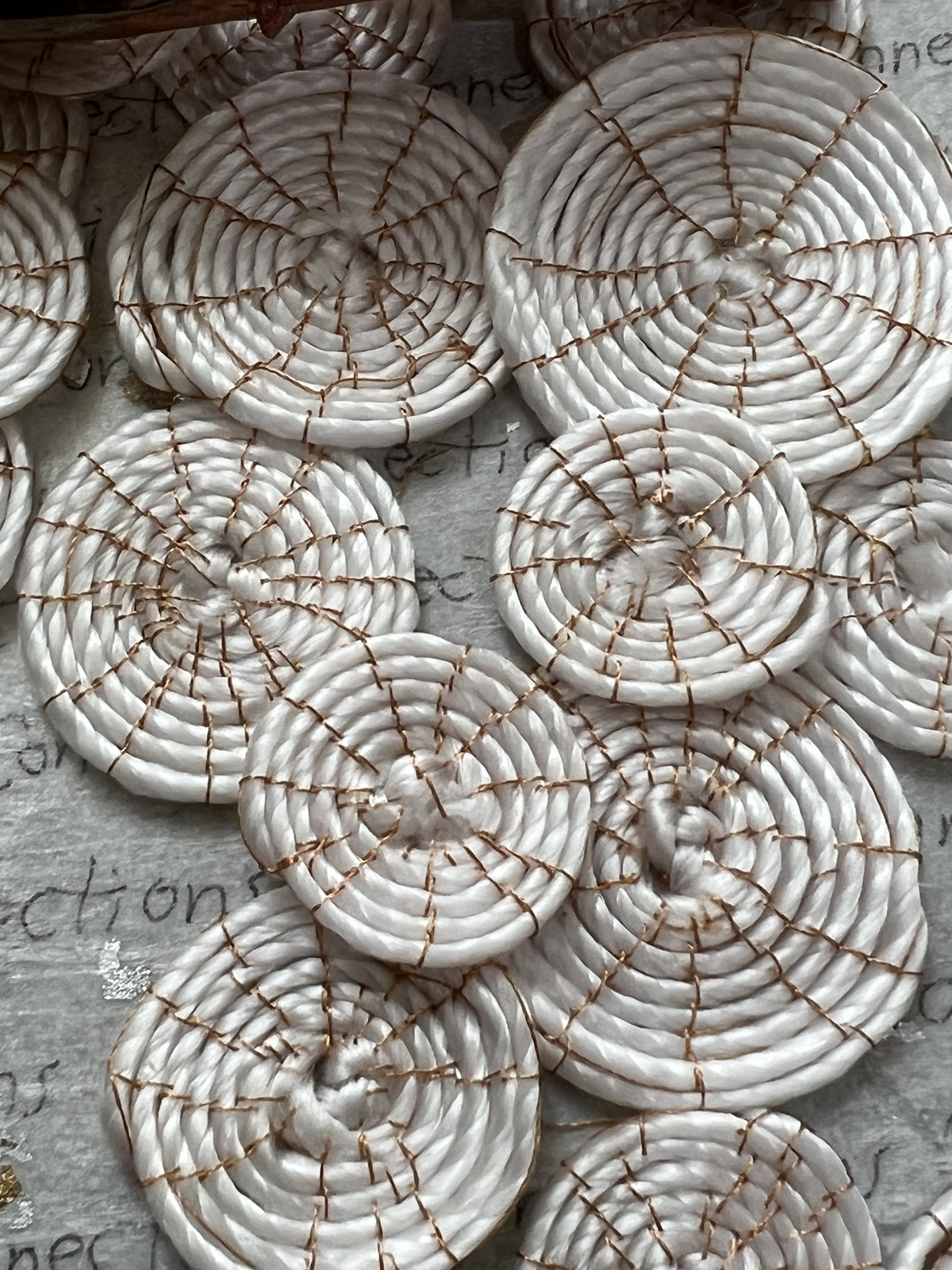 Spirals: (Tore Bellis renamed them rondells). I saw a similar technique while scrolling social media and immediately needed a hands-on lesson on how to make them. My mother was kind enough to drop everything and teach me. Once I learned, I couldn’t stop making them. They are relaxing to make while watching tv, while a passenger in the car… while winding down after a long day. But they do take FOREVER to make. They are layered and arranged across the canvas to suggest movement.