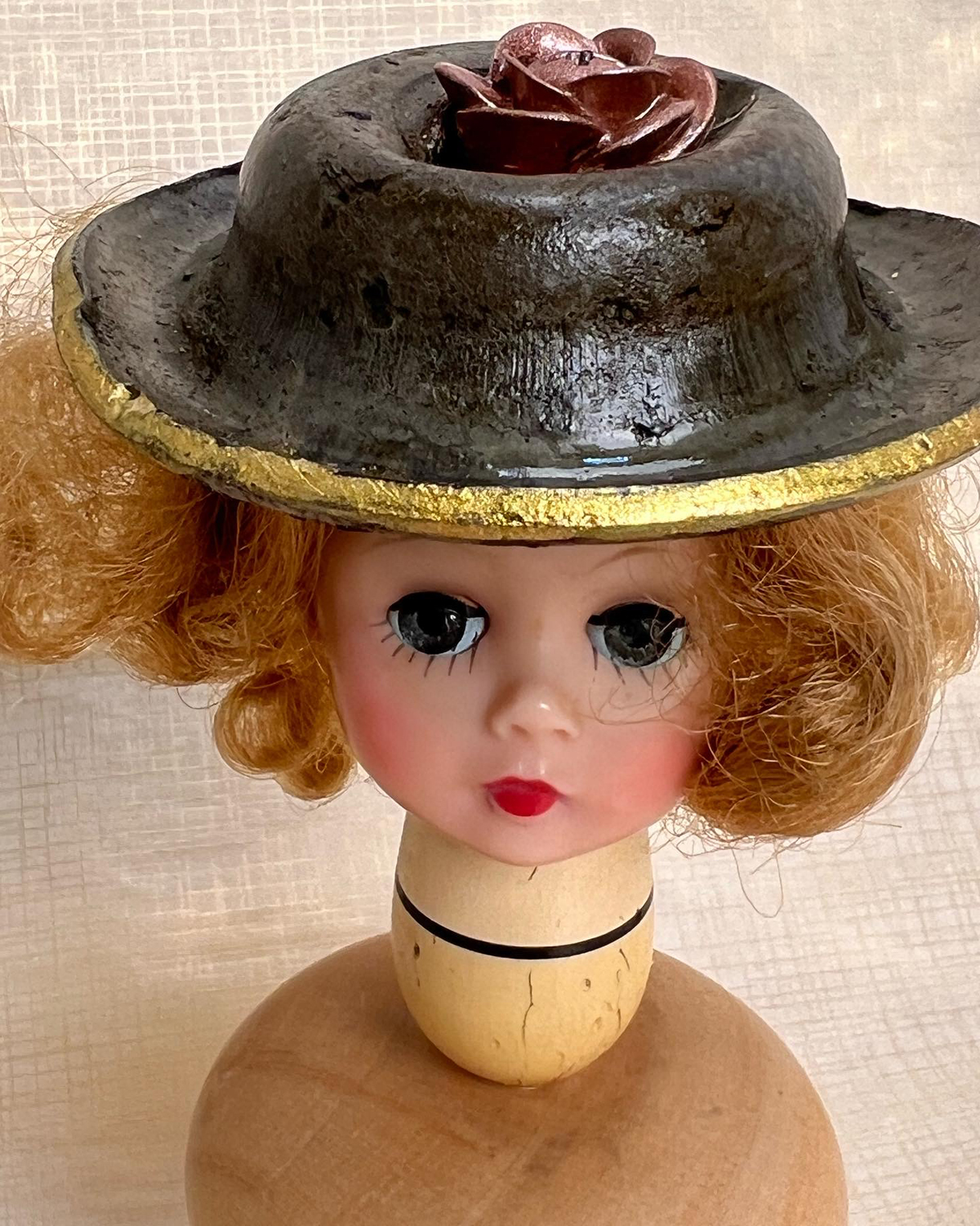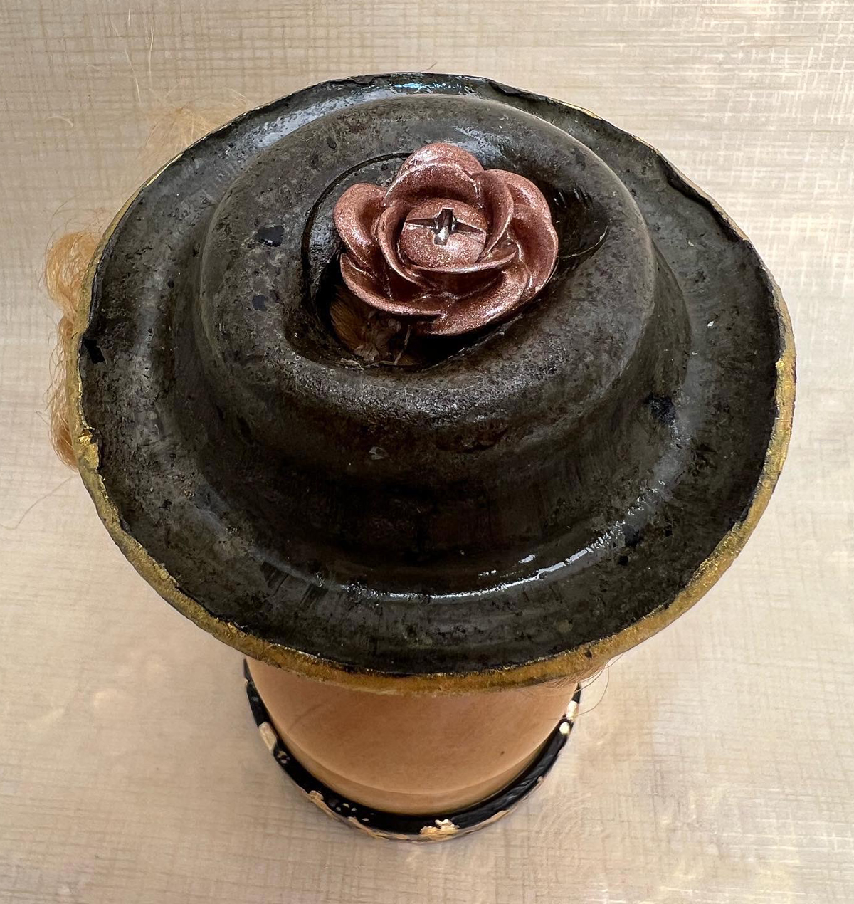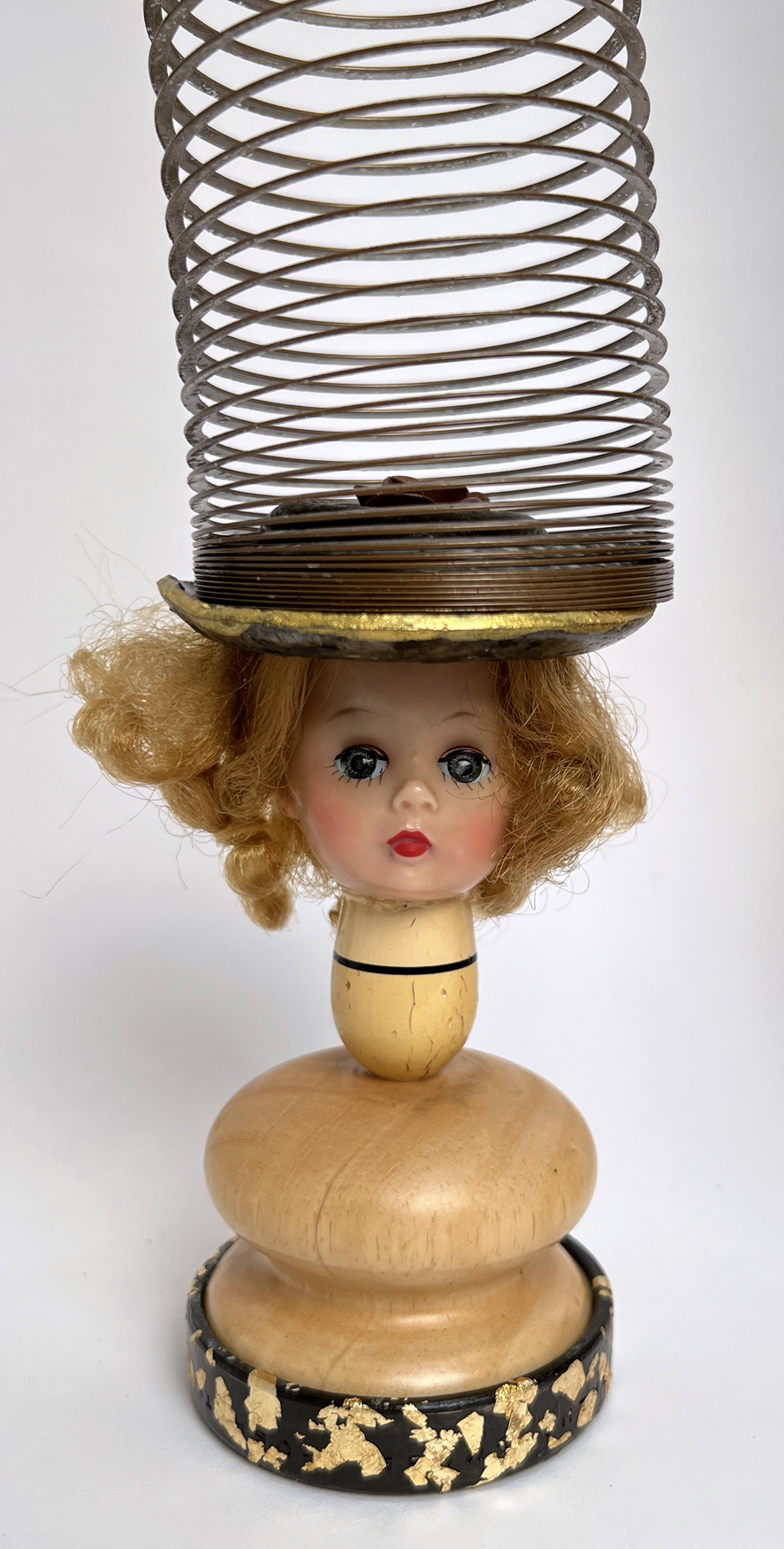 The idea would not have worked had it not been for the metal “hat” I found among the objects my aunt/cousins gave me. It’s bent perfectly in the shape of a cowboy hat, fits the doll’s head and is the perfect diameter for the spring. What are the odds? I drilled a hole in the doll’s head (the price of beauty) and secured the metal hat.