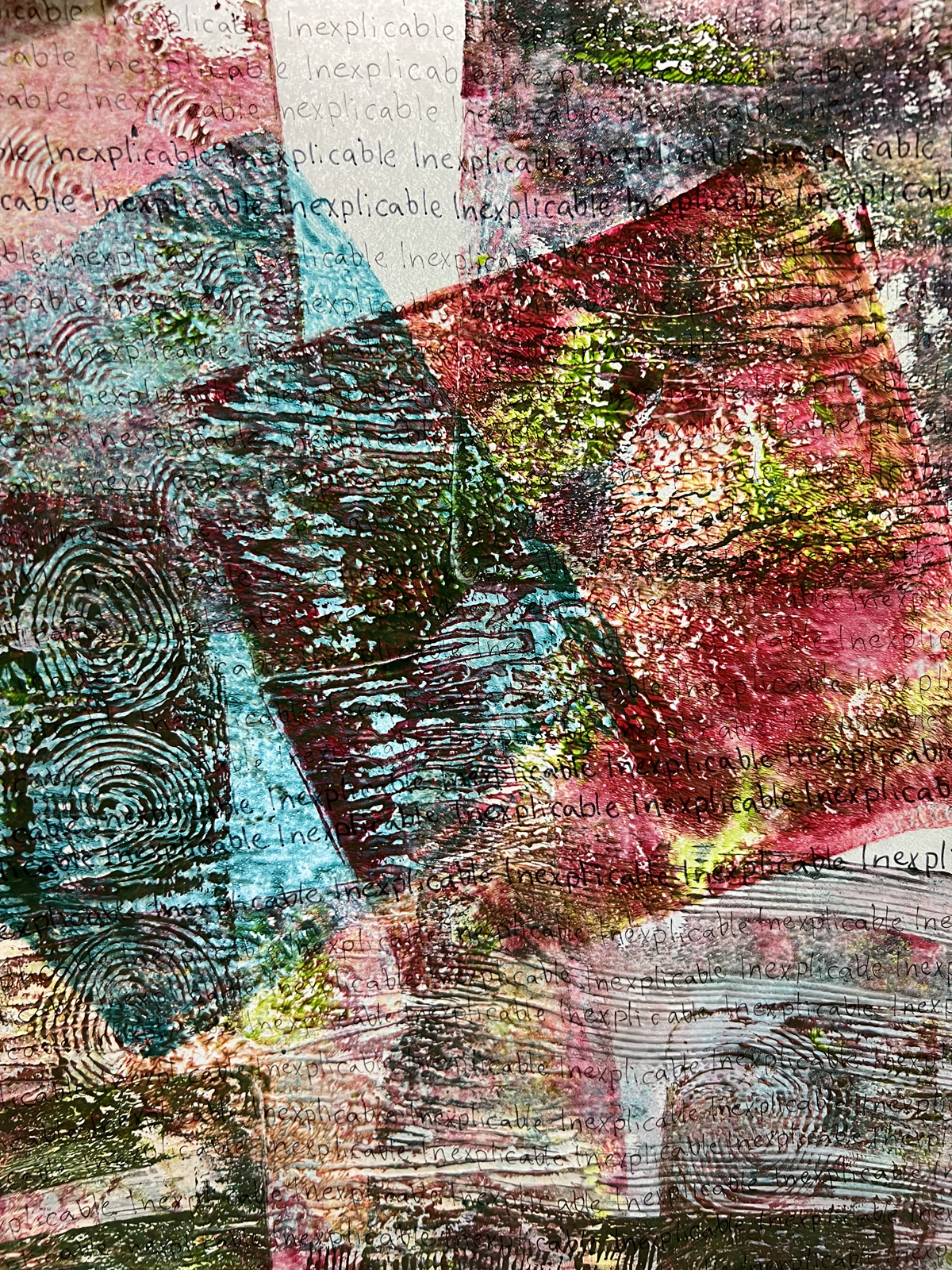 3. Gelli printing techniques: Visual Art League of Lewisville member, Crystal Nelson, was a guest speaker in one of our monthly meetings. She rejuvenated my interest in gelli printing techniques when she demonstrated her skills. After writing “Inexplicable” on the translucent paper, I applied gelli printing with colorful paints to the back of the paper.