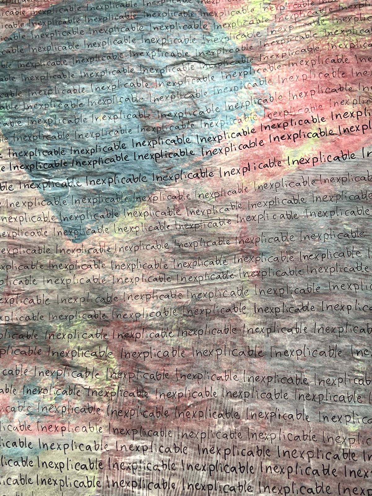 2. Wax paper (wrapped around carboard tube): Paulette Lyman gave me a long roll of translucent paper. I wrote the word “inexplicable” all over the paper.