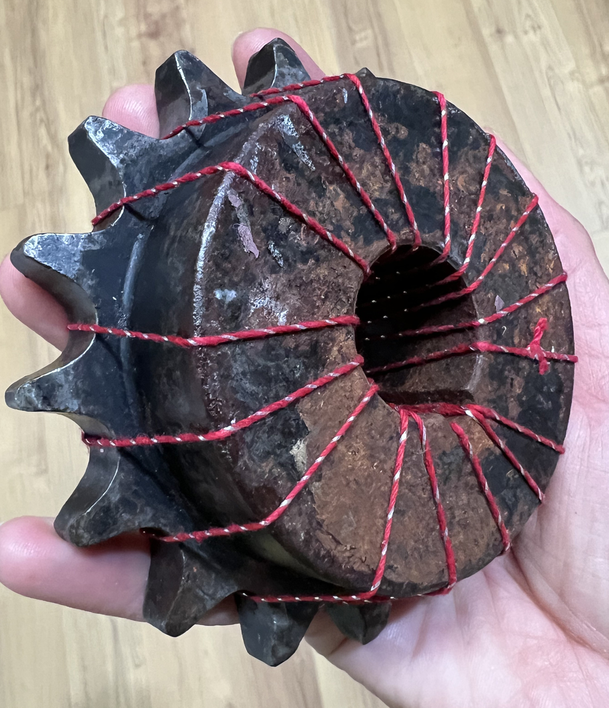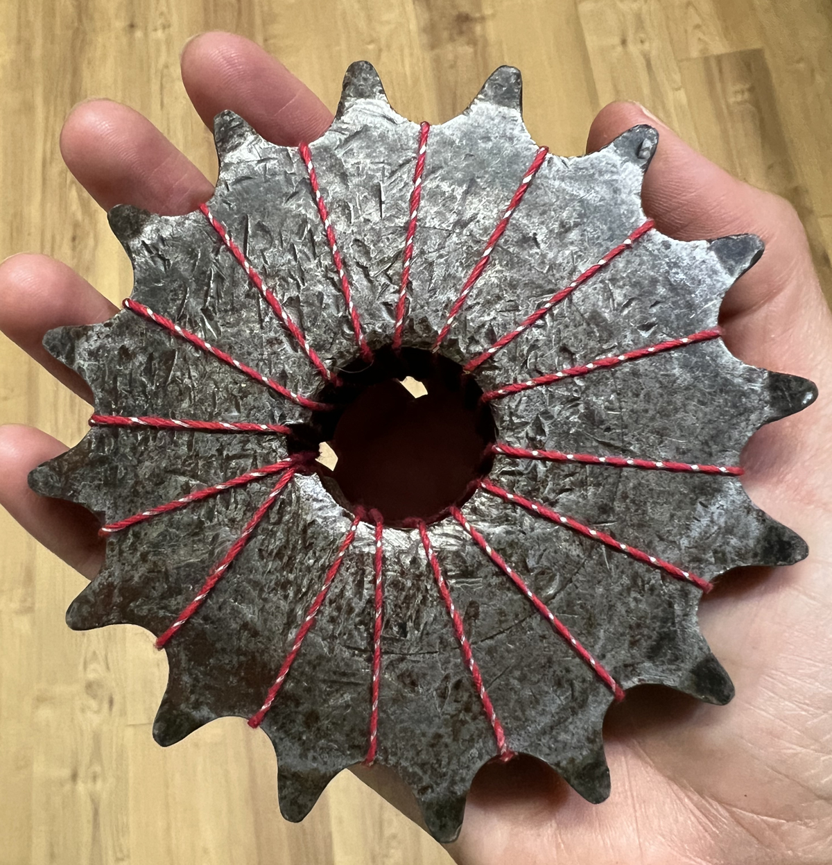 The gear’s weight is balancing the entire art piece!