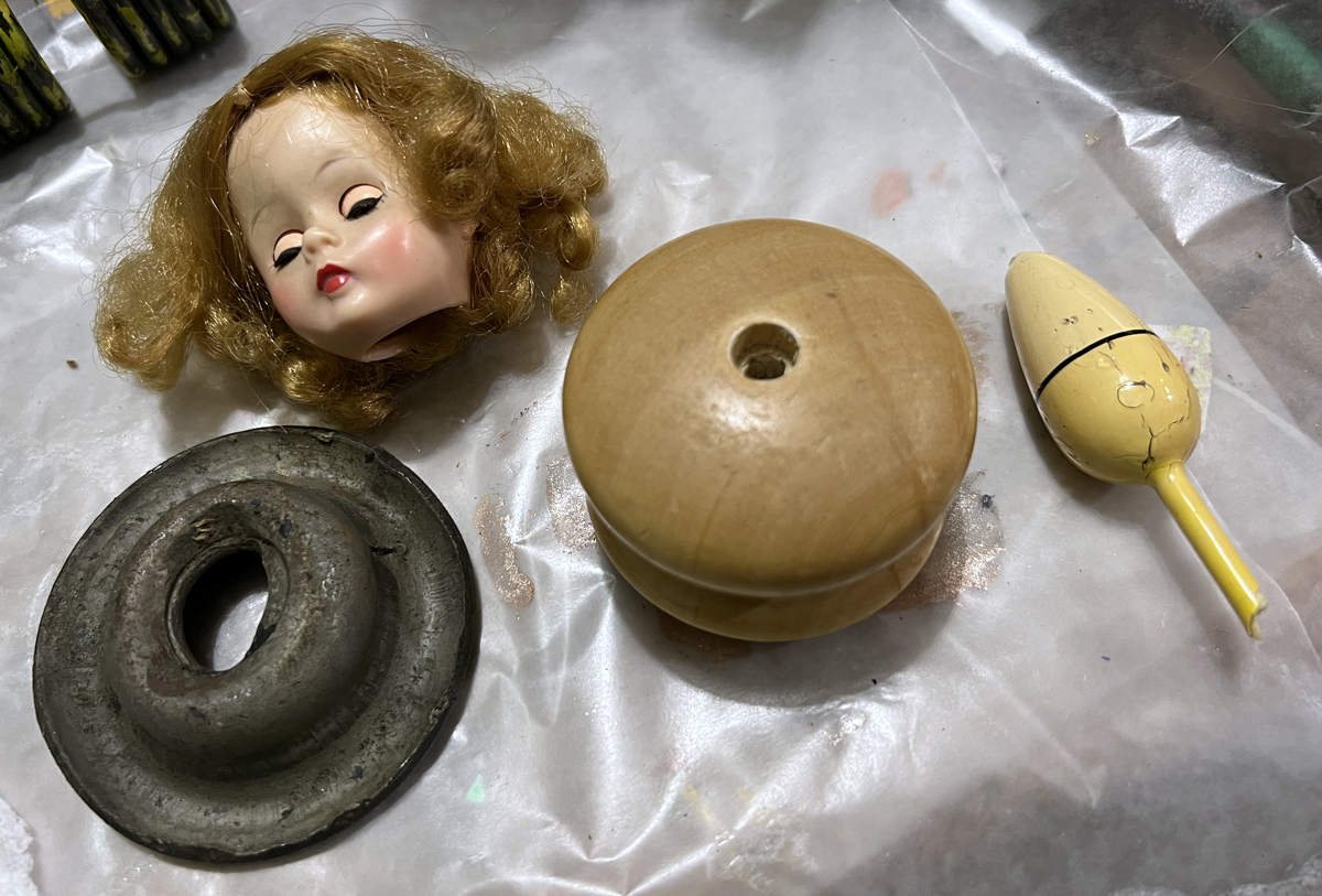 9. Peppermill: My aunt Jennifer gave me a broken peppermill. I took it apart and used the components to make two dolls. Miss Sally Spring, featured in this piece, has the wooden portion of the peppermill as her body.