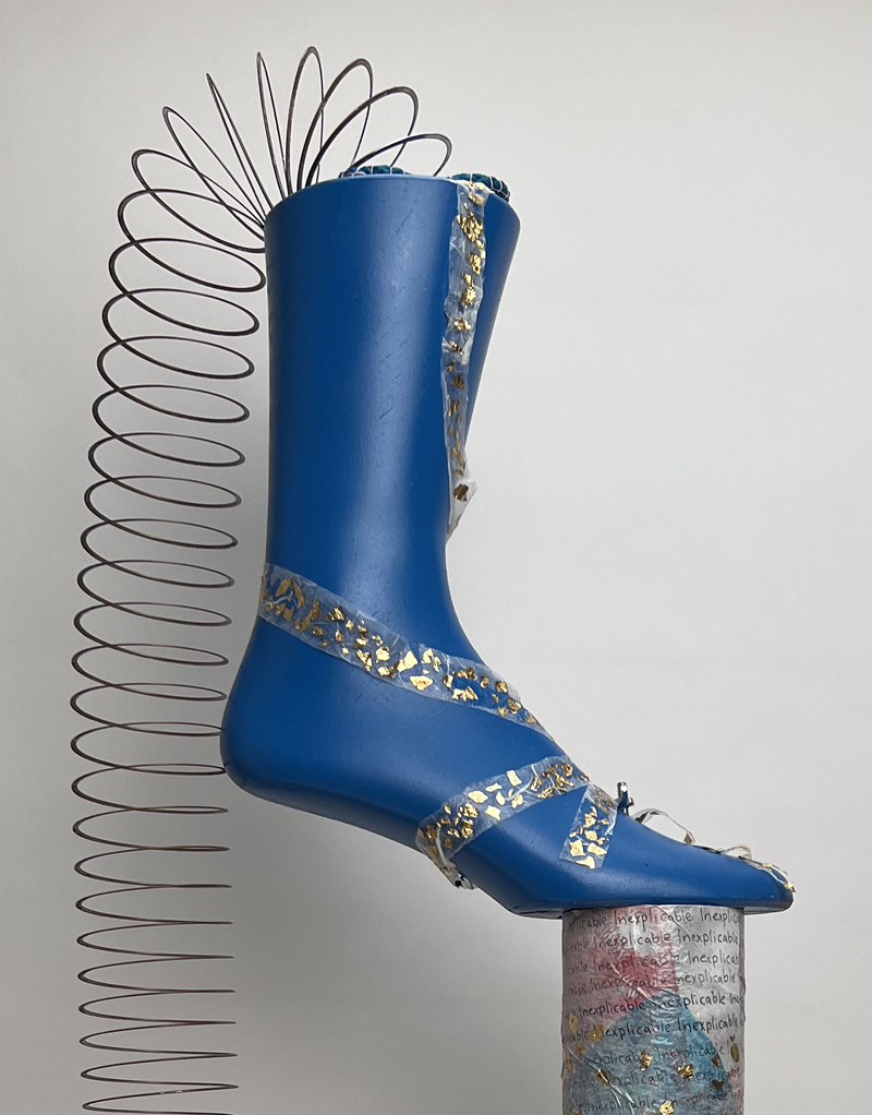 8. Decorative paper: a business associate, Terri Gibbs, discovered I’m an artist. She gave me a pile of delicious decorative paper. I cut strips of the textured white paper and added gold foil. I used glue to stiffen the paper and draped it on the foot to create a ribbon/shoe lace effect.