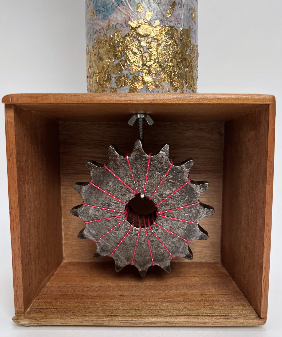 5. All-thread rod: Tore Bellis introduced me to this material. For those unfamiliar, picture a long metal rod that looks like a screw without the head on top. (Or put simply, a long, threaded rod). The rods come in different widths and can be trimmed with the right tools. To hold them in place you can attach nuts, wing nuts or acorn nuts – all of which I used in this piece! The rod goes from the foot down the cardboard tube through the cigar box and in to the metal gear. An acorn nut is securing the rod in to the gear.