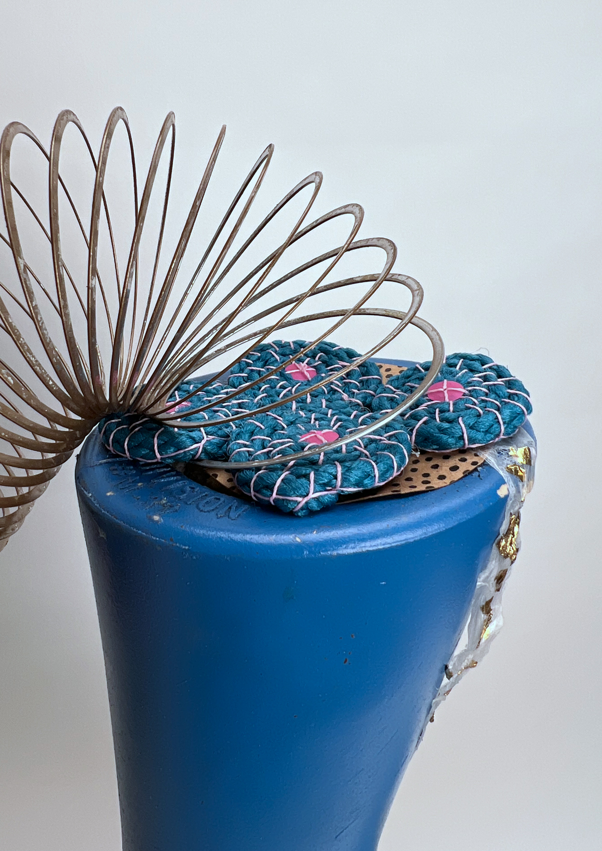 6. Slinky: a prize in a birthday goody bag I received from friends, Kathryn Rebecca Ikle and Andrew Leff. The image below shows the steps I took to spray paint the slinky AFTER I attached it. (It was clearly an afterthought and a risk!)