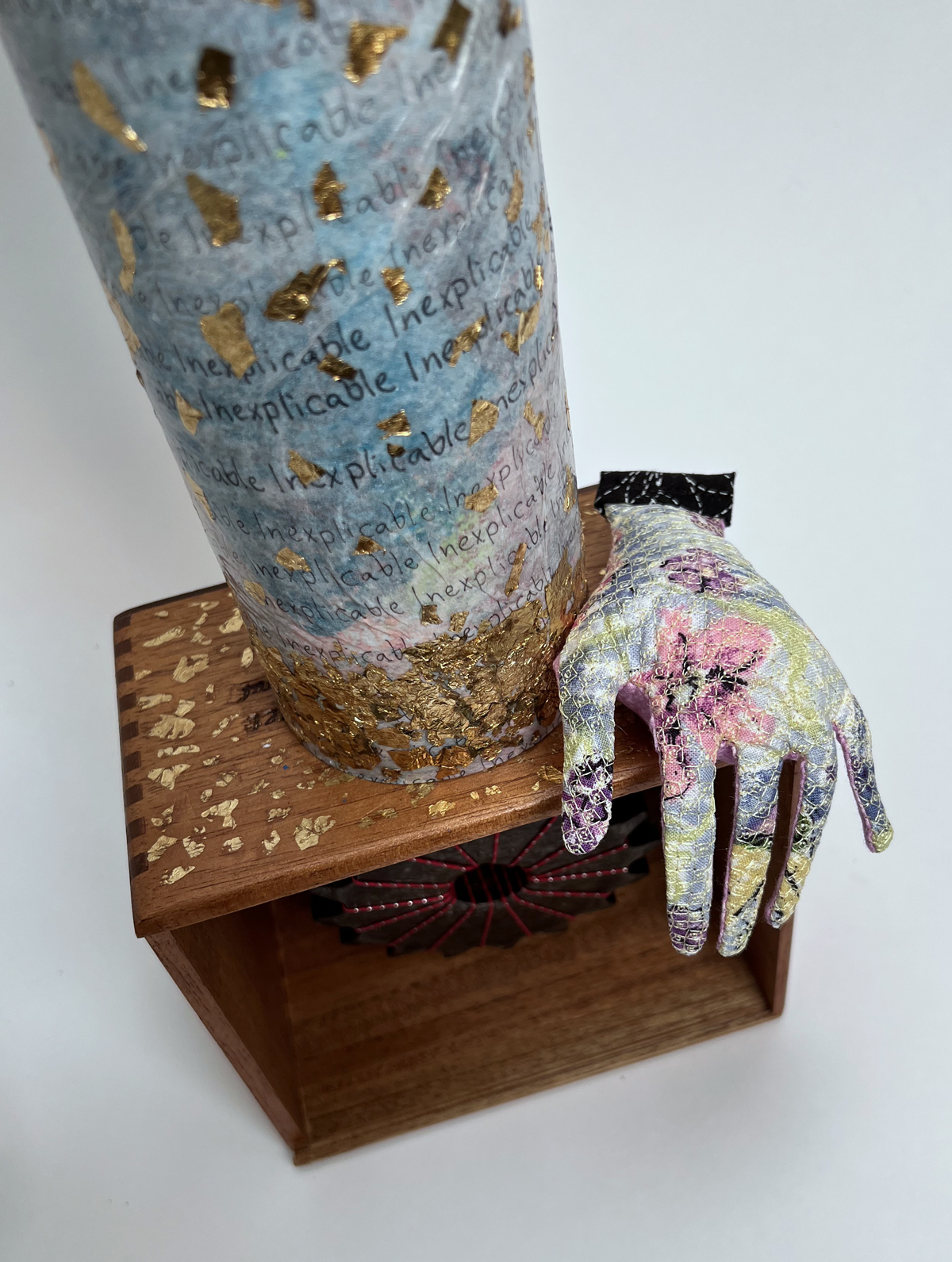 Machine embroidered hand: I traced my hand, shrunk it down and converted it into a machine embroidered hand. The fingers have wire inside so they can bend. It was pure luck the fabric coordinates with the cardboard tube. (I have a pile of pre-made machine embroidered hands for every occasion. But who doesn’t? Ha!)