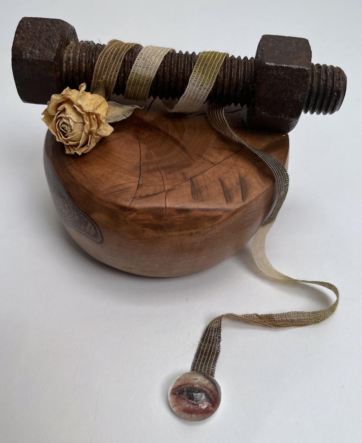 - Glass disc used in vases/home decor: Found object. I cropped a photo of my eye and attached to the glass.