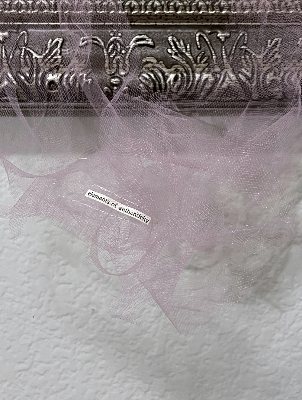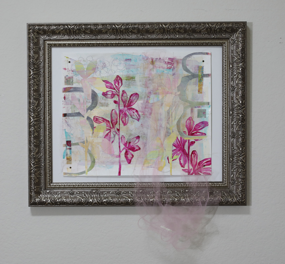 The tulle hangs beyond the artwork and the frame, symbolizing the idea that Crystal and I expressed our individual styles while also finding a way to work together. The outcome of our synergistic creativity cannot be constrained by the paper or the frame.