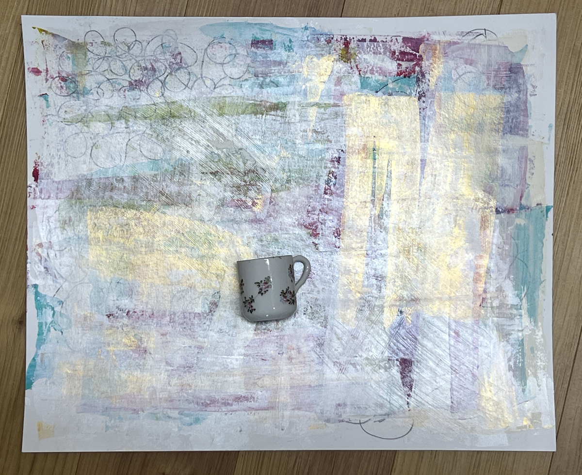Life is a collection of moments woven together to tell a story. The same is true with this artwork. The artwork was inspired by the colors in a teacup recently given to me by my friend Sharon and her husband Paul Haltom. I passed the artwork and the teacup on to Crystal Nelson, who used her well-honed skills to add her artistic elements.