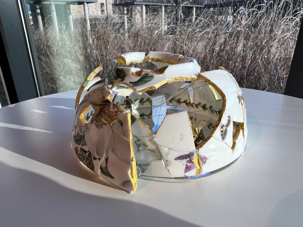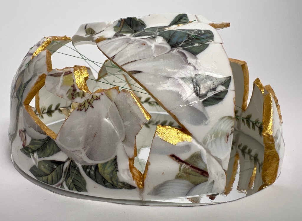 I added thread – which when you look closely, requires the pieces to be extended to add tension. I also painted the broken edges gold – to celebrate the beauty of imperfection. The reflective cardboard adds a level of confusion, which I love!