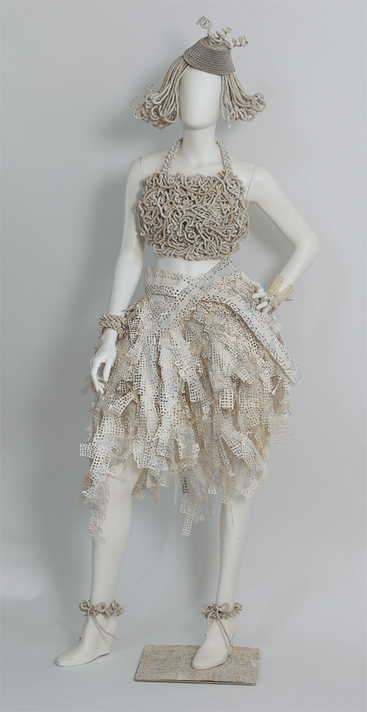 - The bodice, hair, bracelet, hat, ring, anklets are made of hole punches strung on wire.