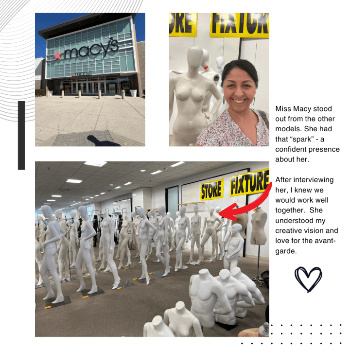 Where to begin? There were so many mannequins to choose from! I walked the “runway” examining the mannequins, trying to imagine them wearing my creations. That’s when I spotted her…. Miss Macy. She carried herself with confidence – I loved her hand on her hip and her built-in “shoes.” Yes, she’s the one for me.